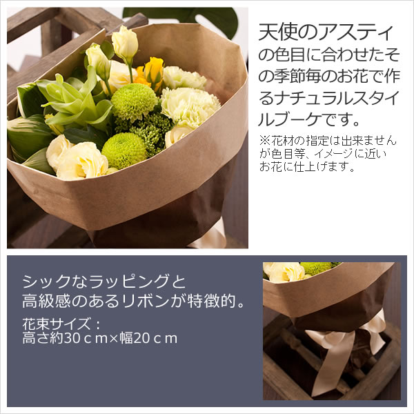 花束サイズ:高さ約30cm×幅20cm セット内容詳細 商品名天使のアスティとナチュラルスタイル花束のセット 商品内容・季節のお花を使った花束・天使のアスティ 750ml・お花のお手入れカード付・ギフトラッピング・メッセージカード付き 商品サイズ花束:高さ約30cm×幅約20cm 箱サイズ:横37.5cm× 奥37.5cm ×高さ45.0cm ※箱のサイズは変わる場合があります お届け予定日の 詳細はこちら>>